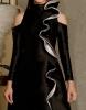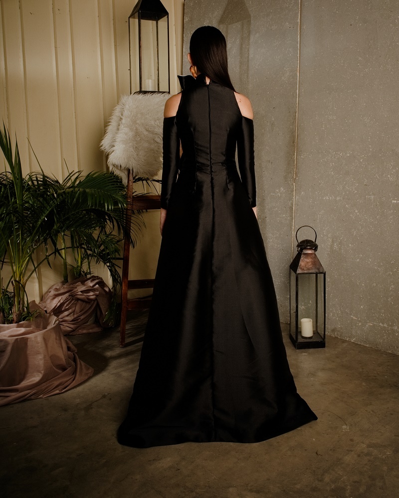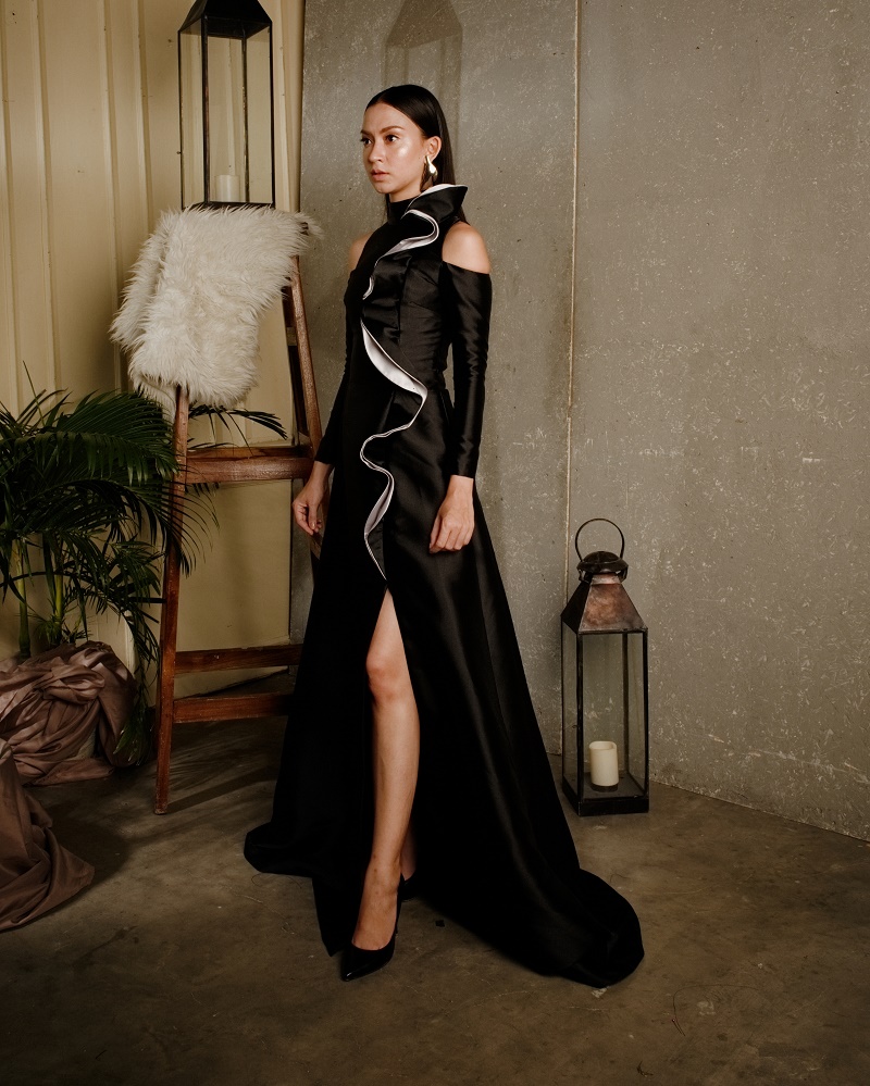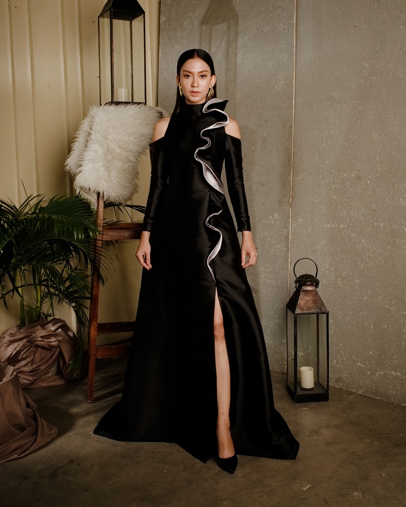 Natalia Soetjipto menciptakan gaun ini. Berpola shoulder dress, koleksi Monochrome itu sepertinya